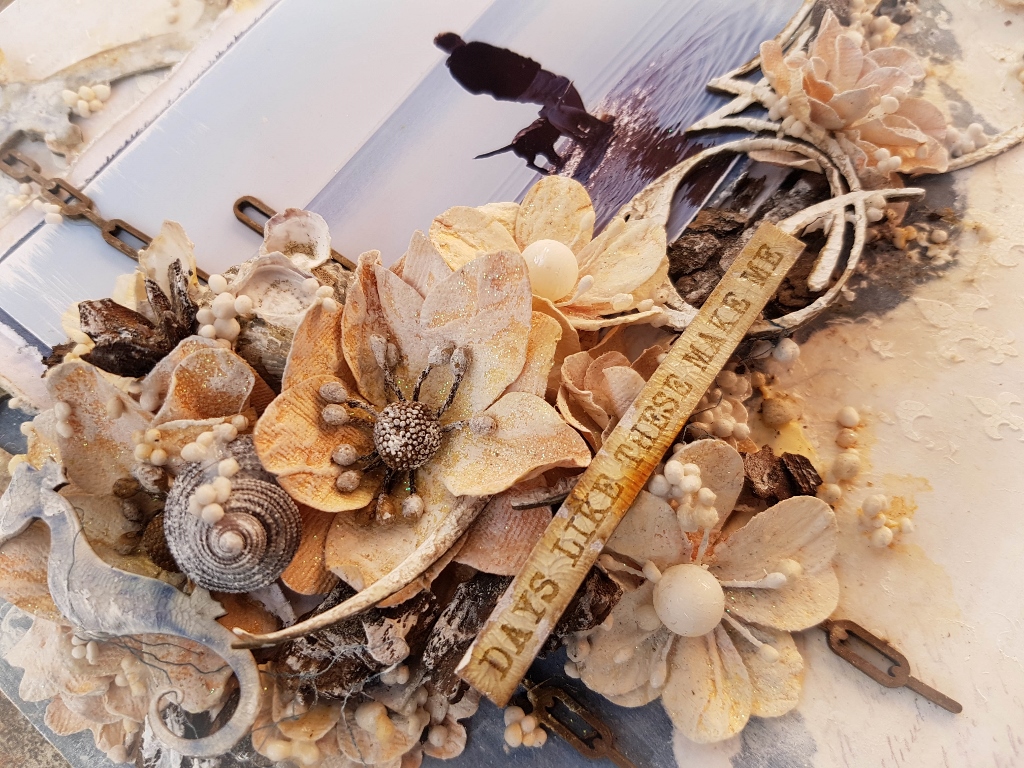 I also used lots and lots of beautiful 49andMarket Shimmer and Shine handmade flowers. They were a perfect match for my seaside project. I used these along with seashells and some seasponge and also a little driftwood that were discovered on our holiday trip. I love to add these little bits and pieces. It for me makes it all that more authentic.