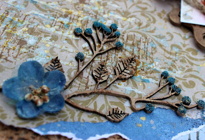 To create texture on my background I have stencilled with the Dusty Attic Creative Script Stencil and Dusty Attic Texture Paste. Once dry I randomly stamped my background with a distressed weatherboard stamp in two tones of brown ink, then flicked over the background with a few blue and soft gold mists to soften the overall effect.